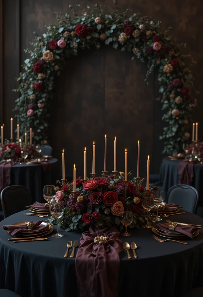 Use black table linens as your base and layer gold charger plates underneath deep red rose and dark dahlia centerpieces. Taper candles in various heights create movement on the table. A foliage-heavy arch draped in dark florals, eucalyptus, and trailing vines makes the ultimate photo backdrop.
