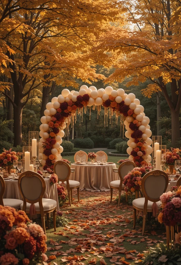 Use gold-painted chairs, dark velvet ribbons on floral arrangements, and tall pillar candles in hurricane glass holders. Mix deep burgundy dahlias with orange marigolds and cream roses for a stunning centerpiece. A themed balloon garland in amber, gold, and ivory floating above the gift table adds that Pinterest-worthy pop.