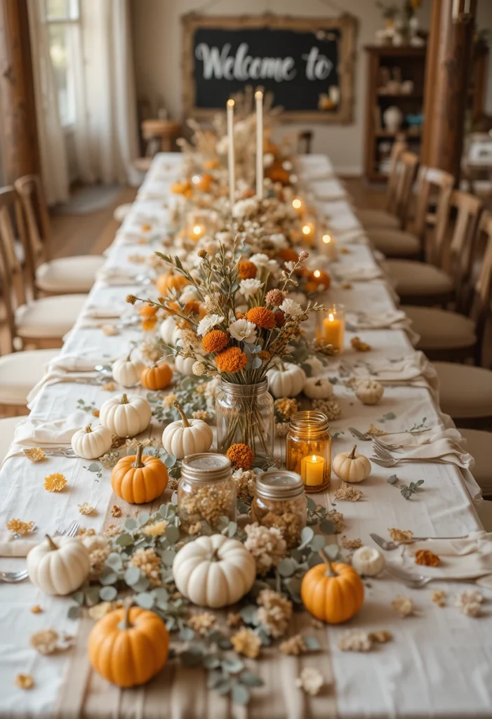 Picture this — a long farmhouse table draped in a cream linen runner, mini white and orange pumpkins scattered between dried eucalyptus stems, and tiny mason jars glowing with candlelight. This rustic baby shower decor idea channels the best of the season without trying too hard.