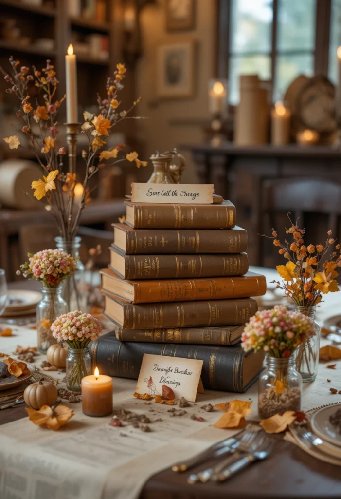 Set out charcuterie-style boards loaded with fall cheeses, honeycomb, figs, and roasted nuts. Use chalkboard signs to label everything with handwritten script. Wrap favors in brown kraft paper tied with twine and a sprig of rosemary. A decorative fall candle set as a centerpiece (cinnamon, apple, or cedar scents) fills the room with warmth that guests can literally smell.