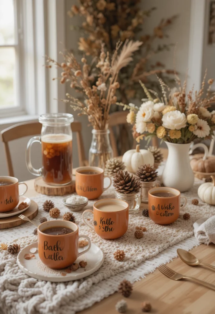Set up a brunch table with a terracotta and oatmeal color scheme. Offer a hot drink bar with apple cider, chai lattes, and seasonal teas. Use knit blankets as table runners (yes, really!) and tuck small pinecones between the centerpieces. Personalized mugs as favors double as decor and a take-home gift guests will actually use.