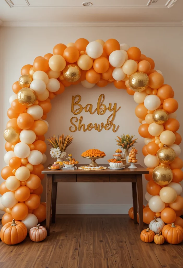 A pumpkin patch theme is one of the most popular fall baby shower ideas. Pumpkins symbolize autumn and instantly create a festive seasonal vibe.