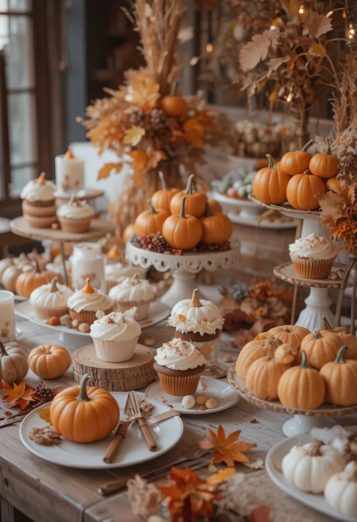 Decorate the dessert table with mini pumpkins, autumn leaves, and rustic cake stands.