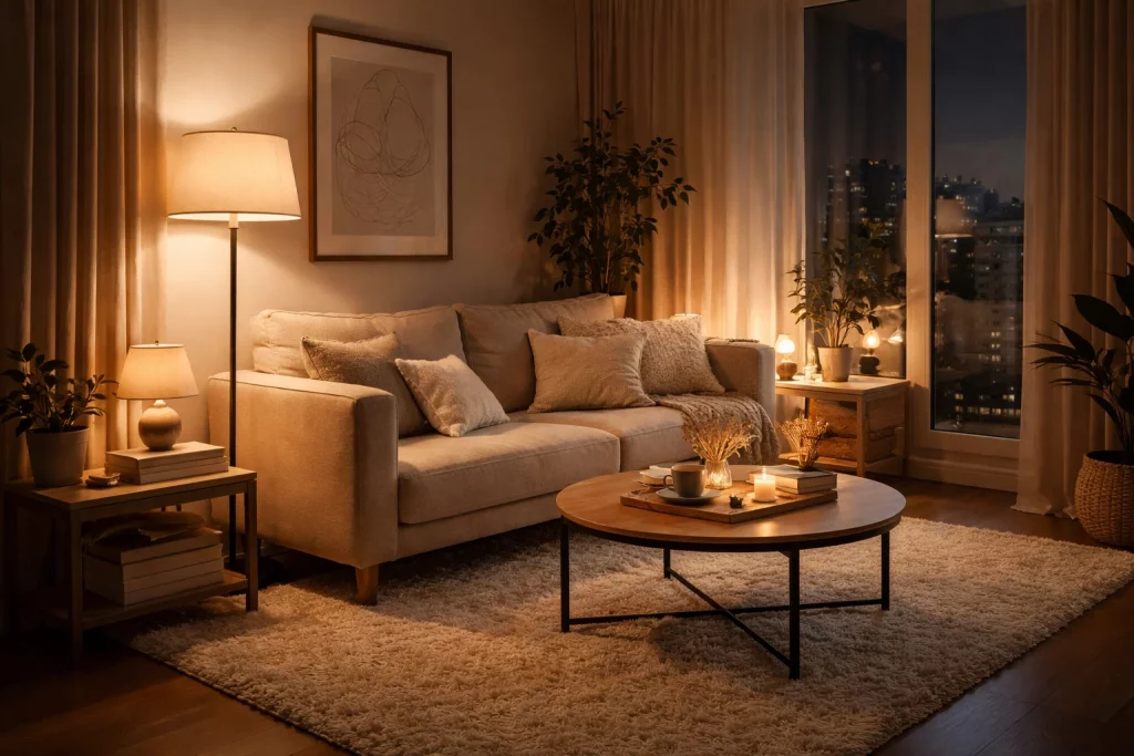 Cozy lighting enhances the beauty of Living Room Decor Ideas for Small Apartments.