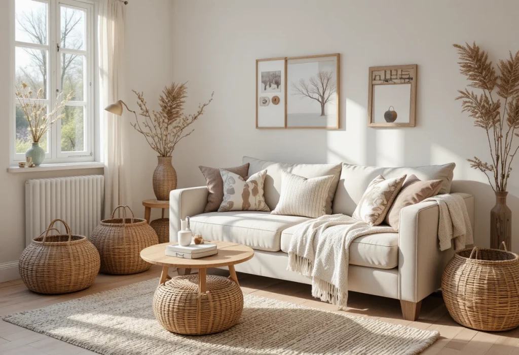 Baskets are simple additions to Living Room Decor Ideas for Small Apartments.