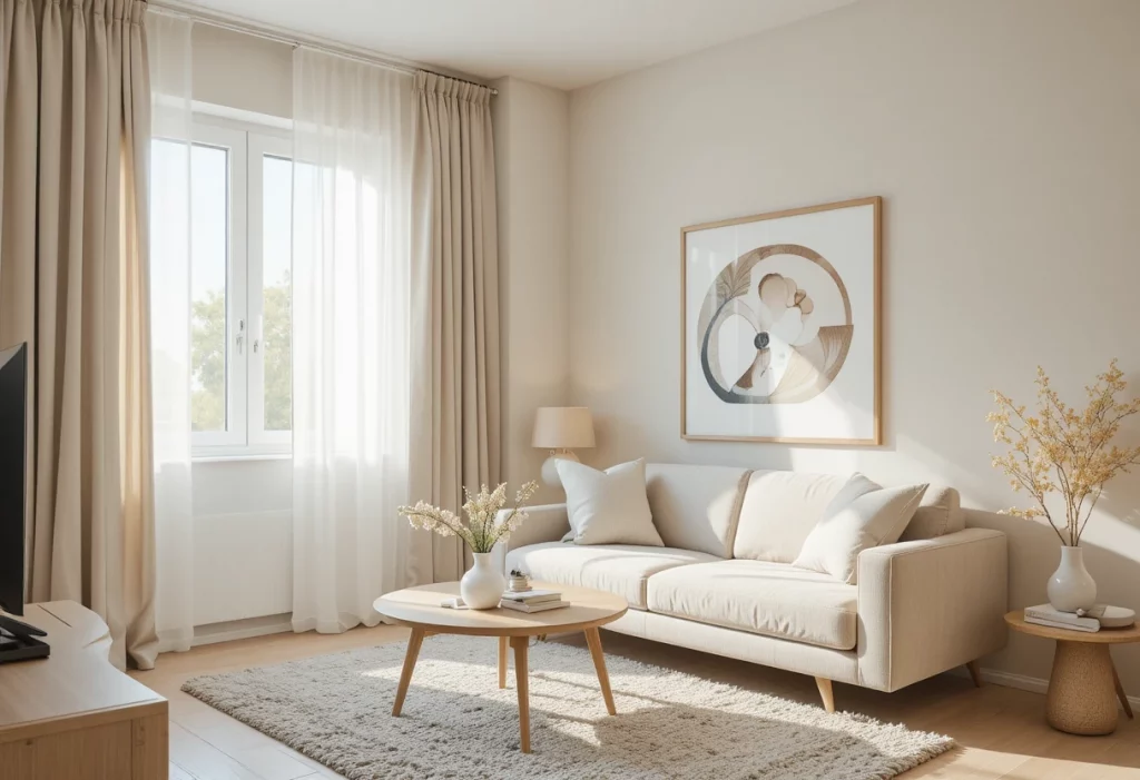 Neutral window treatments complement Living Room Decor Ideas for Small Apartments.